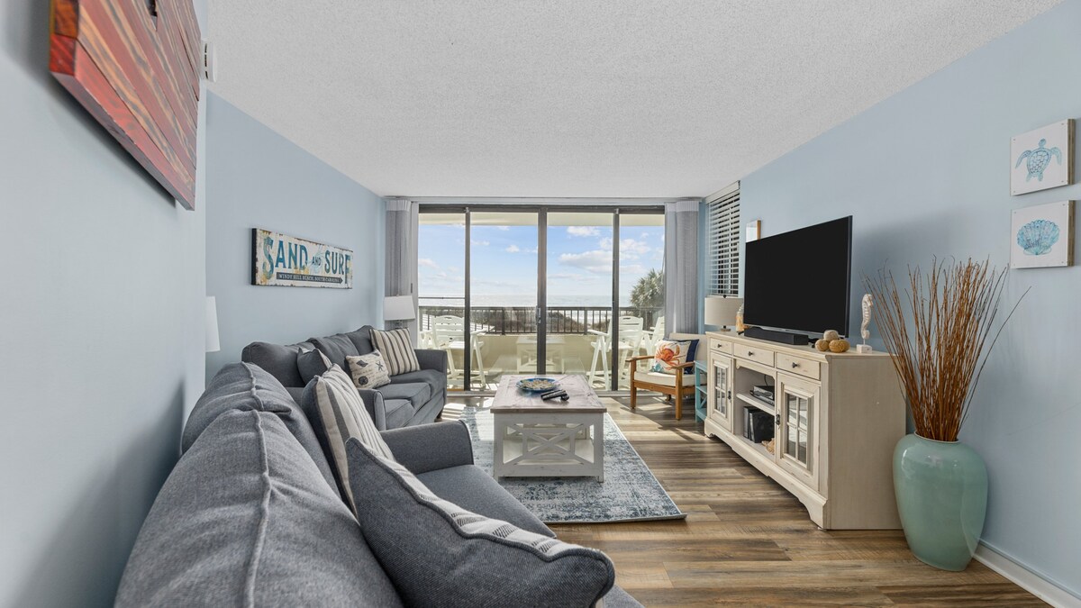 ¡Pregunte por nuestro DESCUENTO para su estancia prolongada! Consigue lo último en serenidad en este condominio frente a la playa que tiene todo lo que necesitas para disfrutar de las aguas de Myrtle Beach al máximo. Este condominio 2br, 2ba viene con una cocina totalmente equipada, un televisor de pantalla grande con cable premium y un patio que se extiende hacia fuera con vistas a la reserva natural, con el agua del océano todavía a la vista. Hay 2 piscinas disponibles para usar y estacionamiento seguro. Venga a experimentar lo relajante que puede ser Myrtle Beach.