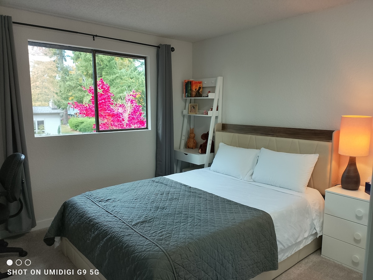 Relájate en esta suite bellamente decorada, perfectamente ubicada para explorar Seattle, Bellevue, Kirkland, Bothell y los lagos, playas, parques estatales y cascadas cercanos. Descubre restaurantes, cafeterías y tiendas locales a pocos minutos. Después de un día de aventura, relájate con una ducha caliente y luego sumérgete en la lujosa cama tamaño king. Disfruta de Netflix en un televisor de alta definición de 65pulgadas, todo en la privacidad de tu propio espacio de 500 pies cuadrados. Con una entrada privada y un barrio tranquilo, tendrás total tranquilidad, sin servicios compartidos.