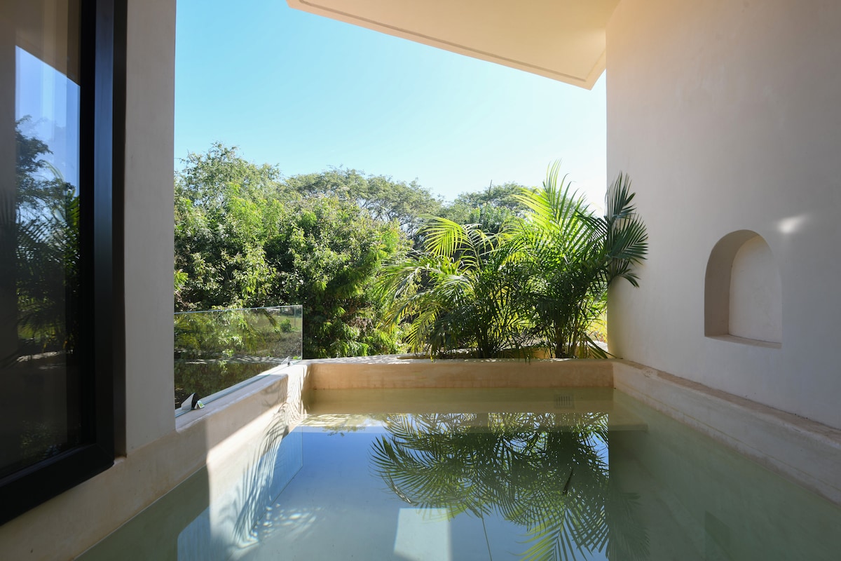 Hermosa y espaciosa suite con cama kingsize, TV giratoria de 50”, Aire acondicionado, cocina, baño y piscina privada. Siente la tranquilidad, relájate en el hidromasaje de tu piscina privada y disfruta de la comodidad de contar con todo lo necesario para una estancia placentera. Nos encontramos en Punta Zicatela, a 7 minutos caminando de la playa, principal punto de surf, restaurantes, bares y zona comercial. Cerca de todo, pero fuera del bullicio de la fiesta. Contamos con Internet Starlink
