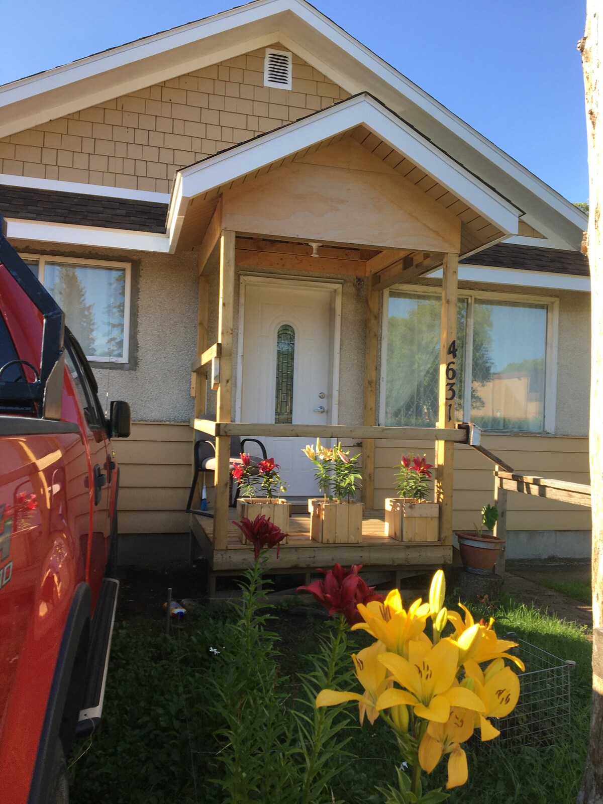 Estamos en diez acres, a diez minutos al NE de Lloydminster. Puedes disfrutar de los jardines, los pollos y una gran fogata para asar salchichas y malvaviscos. En el interior tenemos una sauna, una pequeña sala de estar con dos dormitorios, un baño y una cocina completa. Tiene capacidad para seis personas muy cómodamente y 9 cuando incluyes el sofá y dos pequeños colchones inflables. El desayuno se sirve arriba o se puede comer fuera en la terraza. ($15 por adulto y $10 para niños de 12 años o menos) Reserva con anticipación.