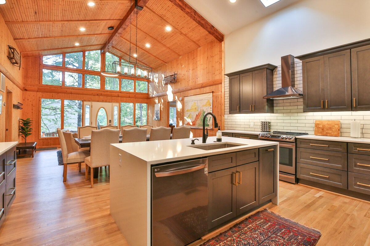 ¡Uno de los 12 mejores Airbnb de la revista Washingtonian para escapadas de esquí cerca de DC! Una joya hermosa y única con preciosas vistas a las montañas en Bryce Resort. A menos de una milla del albergue. Actualizado con buen gusto y lujosamente amueblado. Abierto y luminoso, con grandes ventanales que traen el aire libre al interior. Tres niveles con un divertido sótano, con una gran televisión, mesa de póquer y hockey de burbujas. La cocina está bien equipada. ¡Un refugio perfecto para llamar hogar durante tu escapada! ¡Cargador gratuito de nivel 2 para vehículos eléctricos (NEMA 14-50)!