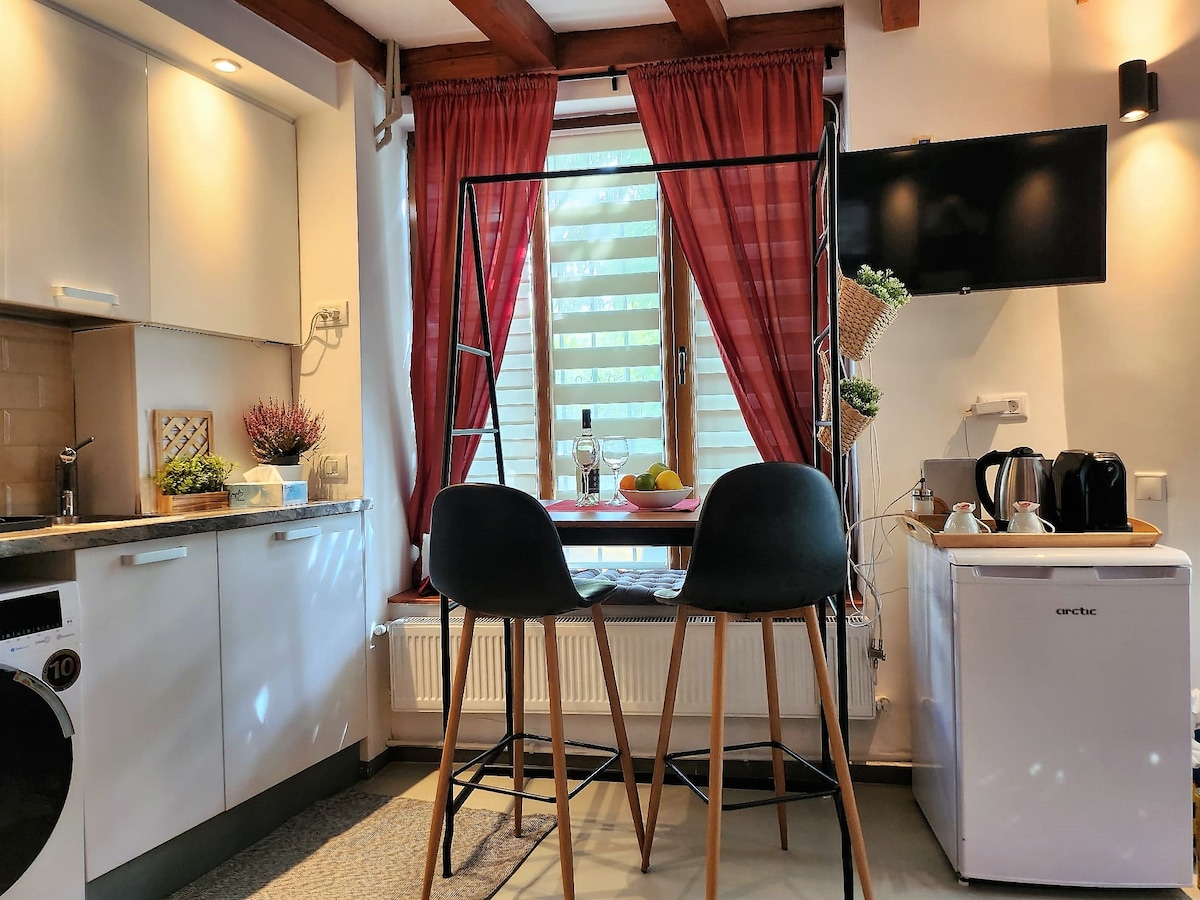 Ubicado en el centro con varios puntos de interés cerca, nuestro apartamento estudio ofrece un concepto diseñado en una mezcla de accesorios modernos y elementos tradicionales como escaleras y vigas de madera integradas en el espacio para tus momentos cómodos.