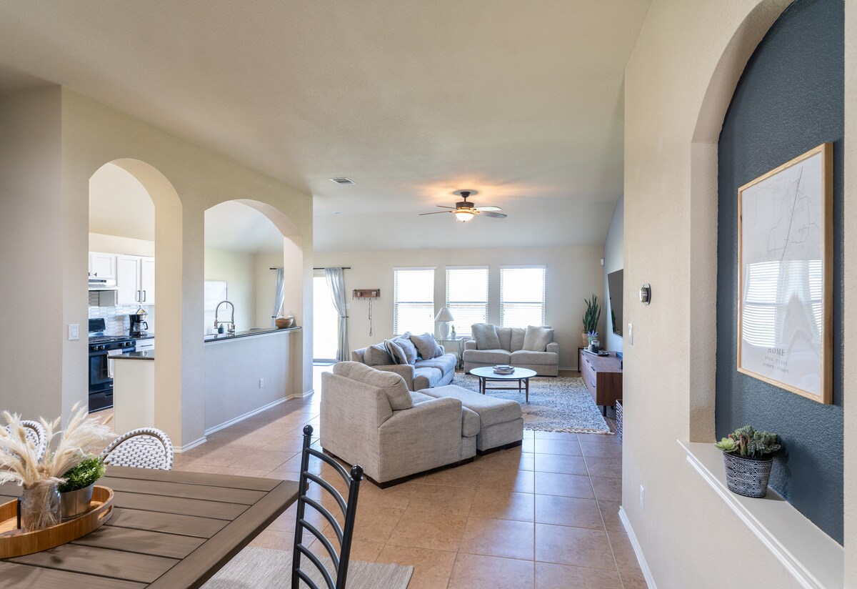 Bienvenido a este relajante hogar lejos de casa, remodelado con mucho gusto, un refugio de concepto abierto en el centro de Texas. Una cocina totalmente amueblada para comer y hornear está a tu disposición. El espacio al aire libre es ideal para asar a la parrilla y relajarse en el patio sombreado situado en un patio trasero arbolado. Hay disponibles varios juegos al aire libre. Dos dormitorios tienen camas tamaño queen, el otro tiene 2 camas individuales, un sofá cama Ashley Furniture con colchón tamaño queen de espuma viscoelástica. La suite principal tiene un espacio de trabajo dedicado.