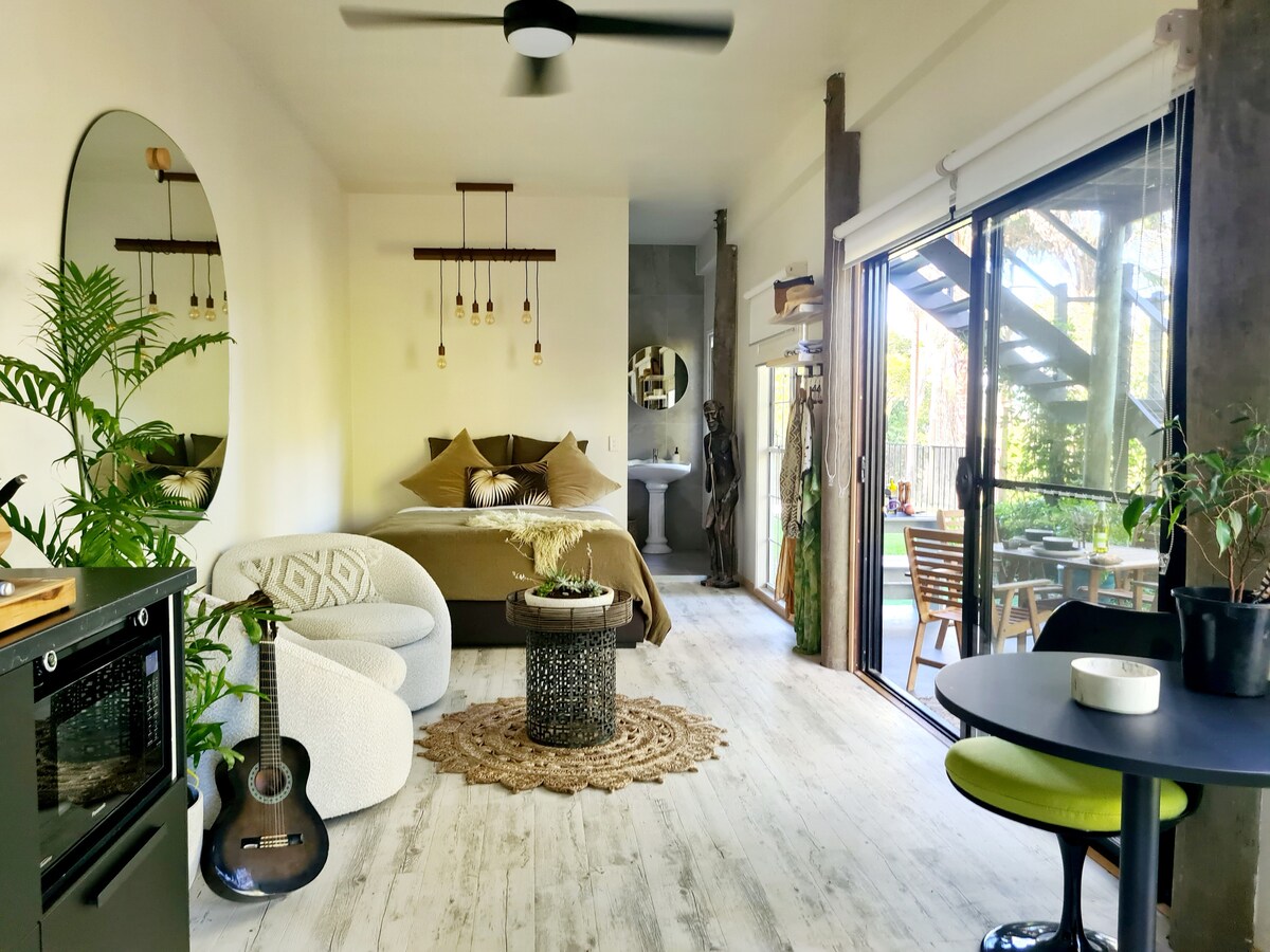 El estudio es un apartamento de 1 dormitorio luminoso, limpio, espacioso y elegantemente decorado en el nivel inferior de nuestra casa, dos pasos arriba, por lo que no es apto para discapacitados, ideal para parejas, (lo sentimos, no es apto para niños). Hay una cocina americana bien equipada, un gran diván de esquina, una cama tamaño queen con la parte superior acolchada, un romántico dormitorio a la luz de las velas, aire acondicionado de ciclo inverso, WIFI, un televisor de pantalla inteligente grande con dispositivo de transmisión Chromecast para ver Netflix, Stan o cualquier plataforma que utilices. Barbacoa privada