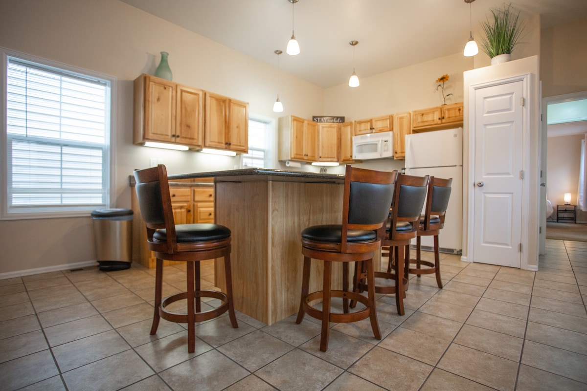 Ven a disfrutar de nuestros 5 acres privados de árboles Pinon con la comodidad de estar a 5 minutos de la ciudad. Disfruta de las alegrías de los niños en la propiedad y las vistas de increíbles montañas con la vida silvestre que frecuenta nuestro "patio trasero". Relájate en nuestra zona de huéspedes privada cerrada con el resto de nuestra casa, que incluye una pequeña cocina y un área de lavandería, todo separado del resto de la casa por una puerta personalizada construida y con cerradura. Aceptamos perros, pero no podemos aceptar gatos debido a las alergias de otros huéspedes. Se aplica una tarifa por mascota.