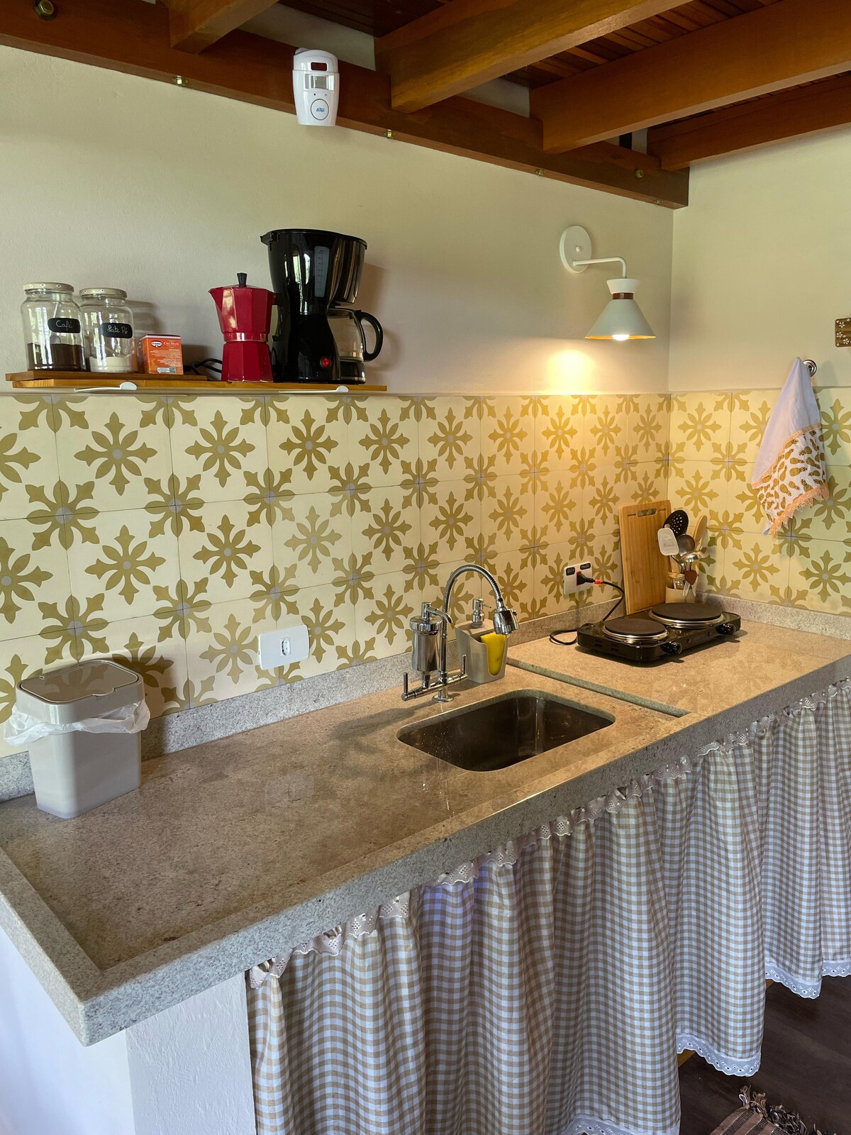 Nuestra casa de campo ofrece mucha calidez en una encantadora zona rural rodeada de naturaleza a solo 6 minutos del centro de la ciudad. Cuenta con un encantador altillo con cama tamaño queen, TV con streaming y cortinas opacas. Abajo, un sofá cama doble, cocina súper equipada, horno eléctrico, microondas, bañera con vistas a la vegetación y 300 mega de internet. El balcón es una atracción separada, con una hamaca y una mesa de café. La gran área verde y el cielo estrellado por la noche completan la experiencia perfecta para días de relajación.