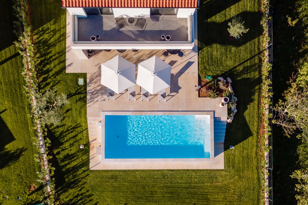 Villa Brtonigla tiene 250 m2 y se divide en planta baja y planta. La villa en sí tiene 3 dormitorios con baños, una cocina con comedor y una amplia sala de estar con acceso a una piscina y jardín. La terraza en el primer piso es de 40 m2 con vistas al mar. La villa está ubicada en una gran parcela de 3350 m2. La casa está a 200 m del centro, a 200 m de la tienda, a 5000 m del mar, a 200 m del restaurante, el médico está a 300 m, la farmacia está a 300 m.