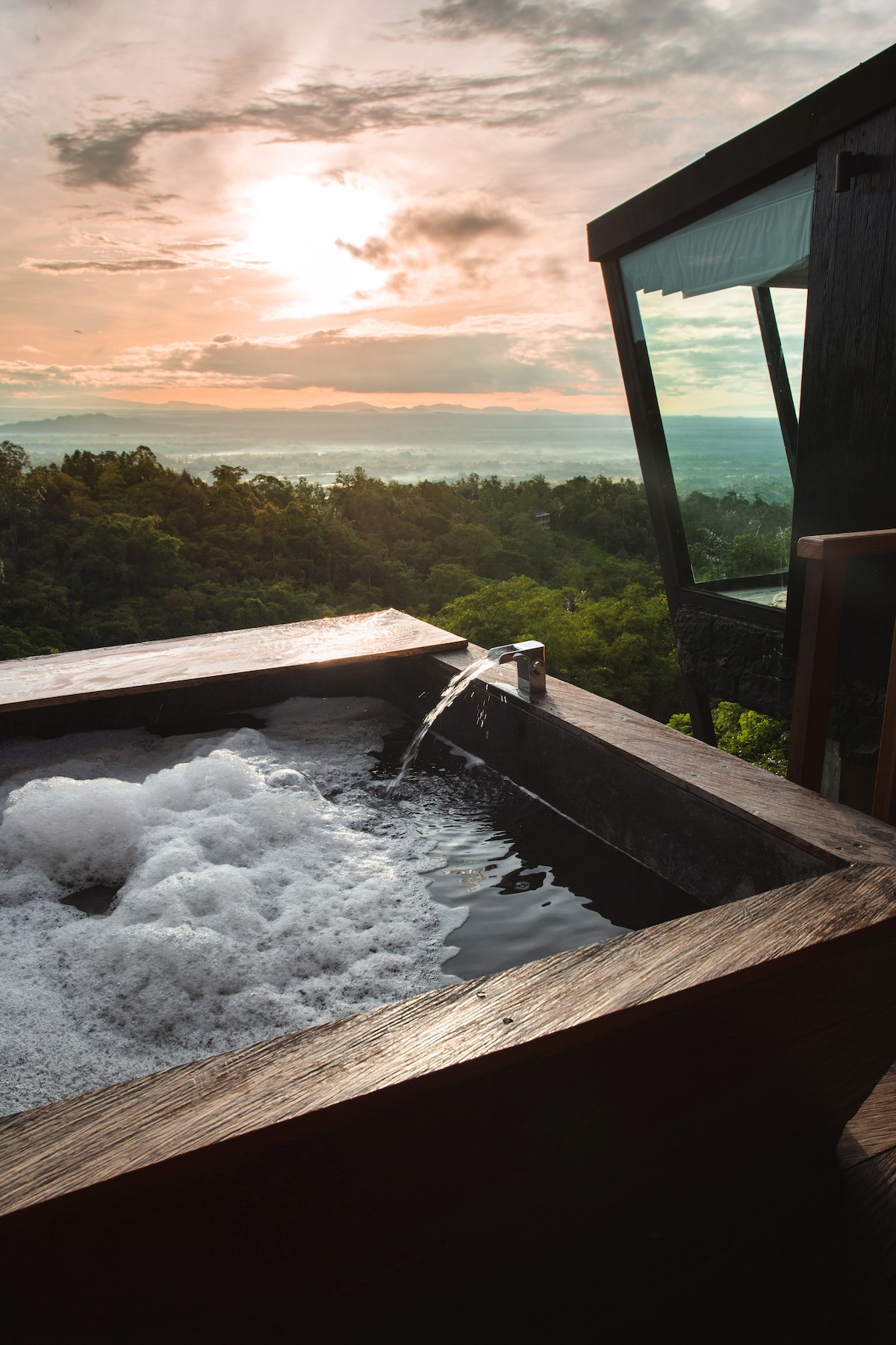 Cabaña de cuatro dormitorios que hemos renovado aplicando un concepto de chalet de esquí. Cada suite tiene una bañera de cobre con vistas al bosque protegido. Las vistas son increíbles, con panorámicas del lago Buyan, el campo de golf Handara y montañas escarpadas al fondo. A 1400 metros sobre el nivel del mar, tenemos la suerte de tener un clima de eterna primavera durante el día con noches frías. Despiértate temprano por la mañana con el olor de las coníferas y da un paseo para ver aves de la selva, ciervos, gatos civetas y una gran variedad de aves.
