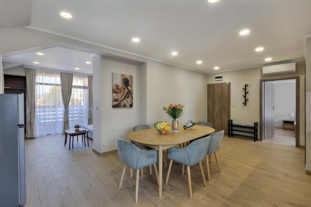 Piso nuevo (tercer piso) con dos modernos dormitorios amueblados, cocina con comedor, sala de estar con sofá y baño. Balcón con vistas a la montaña. La casa tiene un jardín con un pequeño estanque. El lugar es muy tranquilo y acogedor. Ideal para 4-5 personas o 2 familias que pueden compartir el apartamento. La casa se encuentra a 5 km de la estación de esquí Bansko. Ofrecemos servicio de traslado al aeropuerto (recogida/entrega) y servicio de traslado a la estación de esquí de Bansko (para obtener más información o requisitos especiales, puedes hacer una solicitud).