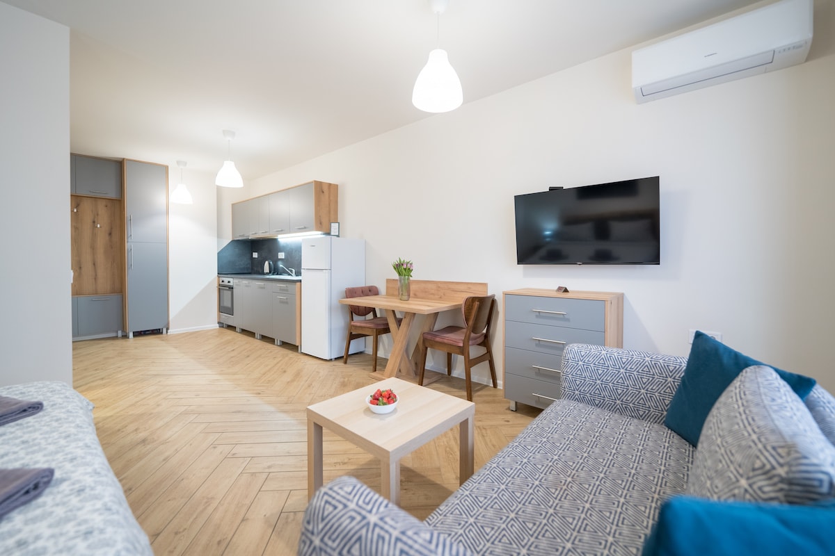 Apartamento a estrenar, muy luminoso, espacioso y totalmente amueblado en un edificio moderno, ubicado cerca del increíble parque de Sandanski. La zona es tranquila y perfecta para unas agradables vacaciones, apta para niños. El apartamento está equipado con todo lo necesario (equipo de cocina completo, cafetera, aire acondicionado en ambas habitaciones, lavadora, plancha, secador de pelo, aspiradora, etc.) Consulta mi perfil para ver la guía que hemos preparado. ¡Estaremos encantados de recibirte! ¡El café corre por cuenta de la casa! :)