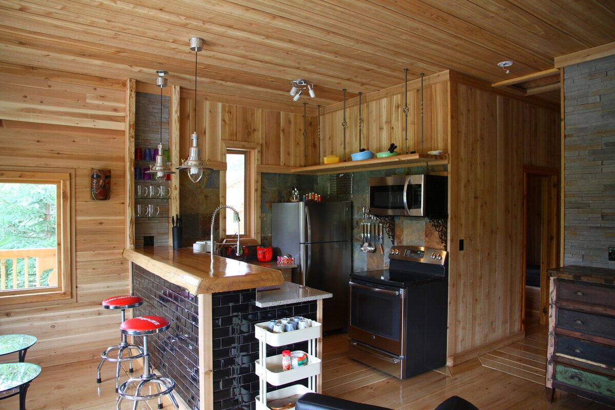 Unas pocas hectáreas a pocos minutos del centro de Smithers. La vista de la cabaña ve hasta los picos de la bahía de Hudson. Kathlyn Creek serpentea a través de la propiedad, lo que la convierte en un gran refugio de verano e invierno. Puede ser una cabaña "pequeña", pero el loft de un niño y el dormitorio en suite hacen que sea una escapada acogedora para una familia de 4 o amigos. Los niños menores de 3 años se quedan gratis. La cocina está equipada para tus primeros desayunos, incluidos huevos frescos diarios.