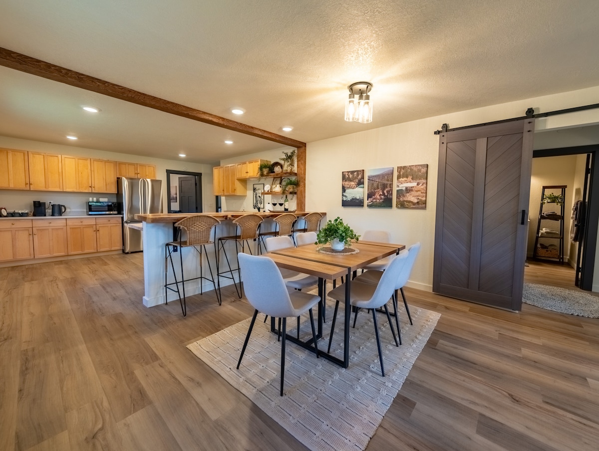 Situado en 2 acres de terreno arbolado privado, puedes relajarte y desconectar en este alojamiento tranquilo, silencioso y elegante ubicado a 5 minutos de la ciudad. Si te gusta el café, tenemos muchas opciones para ti. Disfruta de granos de café espresso recién tostados para usar con una máquina Latte Go o una cafetera. También ofrecemos una Keurig con una gran variedad de cápsulas. Todo lo cual puedes disfrutar sentado afuera alrededor de un pozo de fuego de propano. También hay disponibles una plancha, un pozo de fuego y bicicletas para divertirse al aire libre.