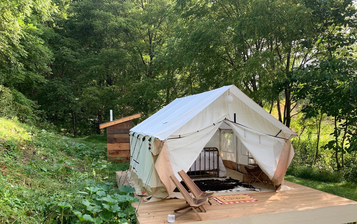 Tienda de campaña de lujo con bañera de hidromasaje privada, baño y fogata ubicada a minutos del centro de Asheville y Blue Ridge Parkway. Disfruta de la comodidad de las sábanas de algodón, las toallas de baño turcas y los colchones tamaño queen en un entorno boscoso ubicado en el corazón de Asheville. Cocina comidas completas en una cocina bien equipada (¡se proporcionan alimentos para el desayuno!). El sitio de glamping está ubicado a 10-15 minutos de TODOS LOS servicios que ofrece Asheville.