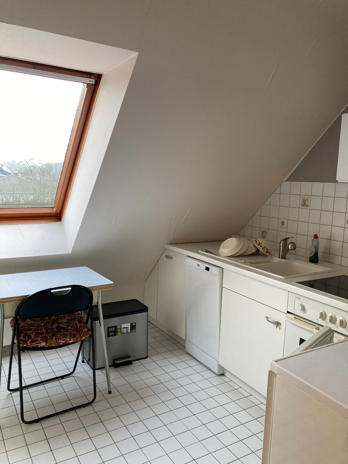 El apartamento con terraza forma parte de nuestro edificio residencial. El espacio es para unas 4 personas. Hay un total de 2 habitaciones. El espacio más pequeño tiene capacidad para 2 colchones y es una sala de paso hasta el baño. La habitación más grande tiene 2 colchones más y una mesa de comedor. El departamento no está renovado y solo ofrece un lugar fácil para hospedarse. Nuestra casa está ubicada fuera del pueblo en una carretera rural (sin peatones/carril bici). En auto, puedes llegar al supermercado en 2 minutos.