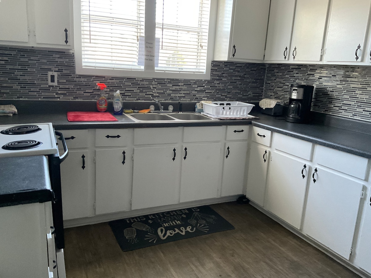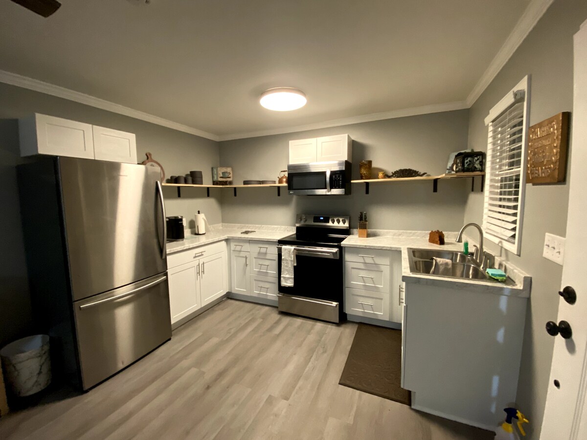 Relájate en esta acogedora cabaña. El retiro La-Z-Boy con un cómodo colchón completo se convierte en una cama doble. Se queda en su lugar de esta manera. Wifi y TV gratis. La cocina está equipada con electrodomésticos de acero inoxidable de tamaño completo. Baño grande con ducha a ras de suelo y el vestidor alberga un equipo de lavadora/secadora apilable.