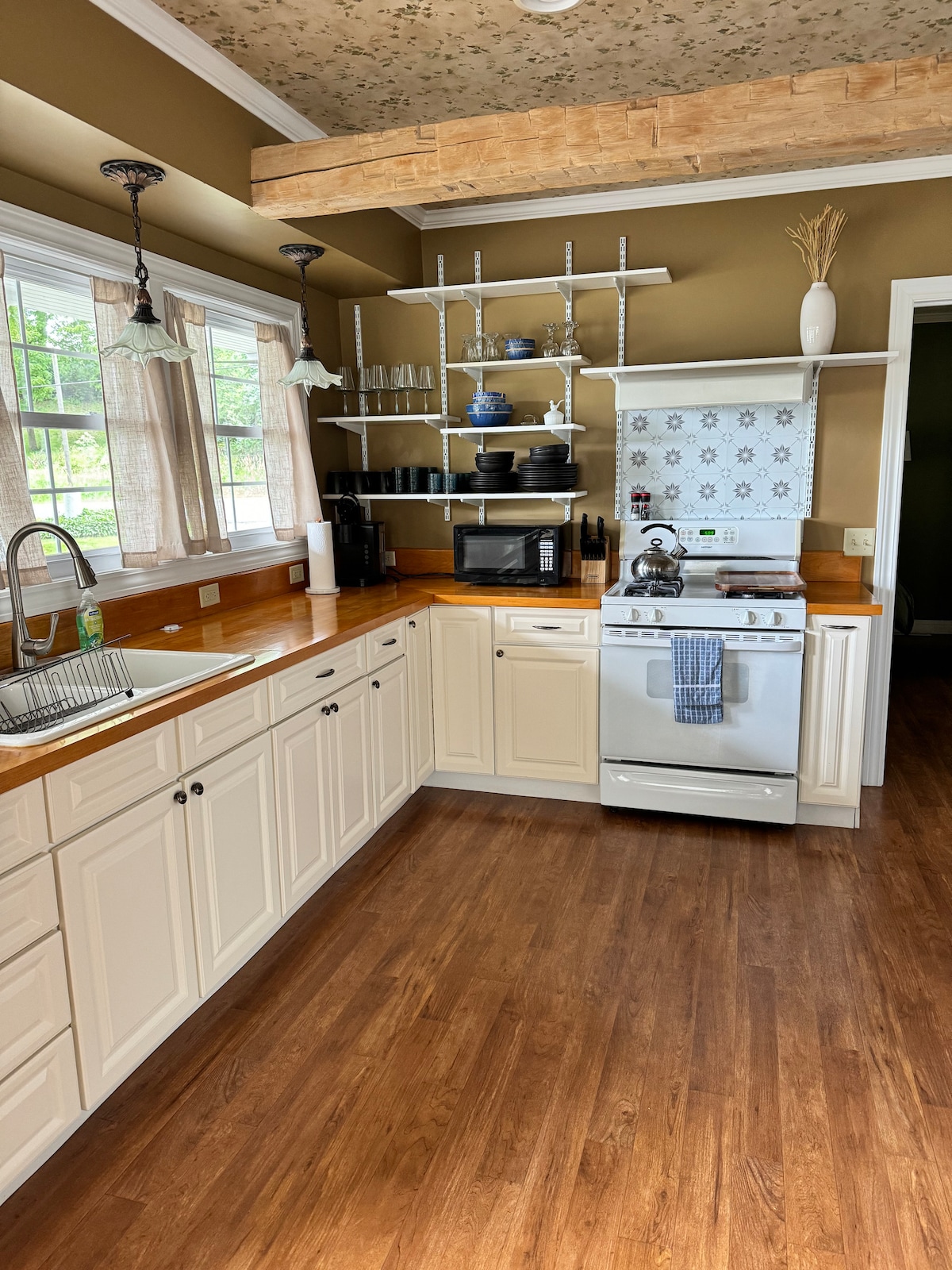 No tienes que haber nacido en un granero para pasar las vacaciones en uno. ¡Cambia la ciudad por millones de estrellas en el cielo nocturno! Al entrar por las puertas francesas, serás recibido por una habitación de concepto abierto decorada con un motivo de granero/industrial. El revestimiento de pino nudoso y acero galvanizado, los suelos de madera junto con un sofá de cuero reclinable y un asiento de dos plazas llenan la habitación. Una cocina completa con encimeras de granito te espera. Hay mucha iluminación natural para las noches.