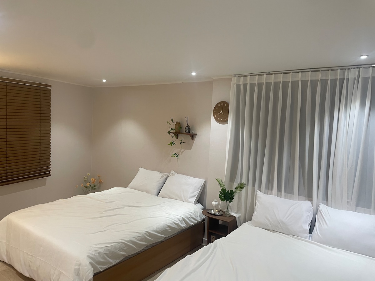 Mi casa está en el centro del pueblo. Puedes llegar desde la estación de Busan o la estación de Choryang hasta aquí en 7 minutos en taxi. Si llegas a mi casa, puedes hacer el check-in por tu cuenta. Mi esposa y yo hicimos diseño de interiores directamente, así que nos encanta más aquí. Ojalá usaras mi casa cómodamente como tu casa. El lugar por el que entras es el segundo piso y hay un sofá, una cocina, un baño. En el tercer piso, hay dos camas queen, un baño, un cofre.