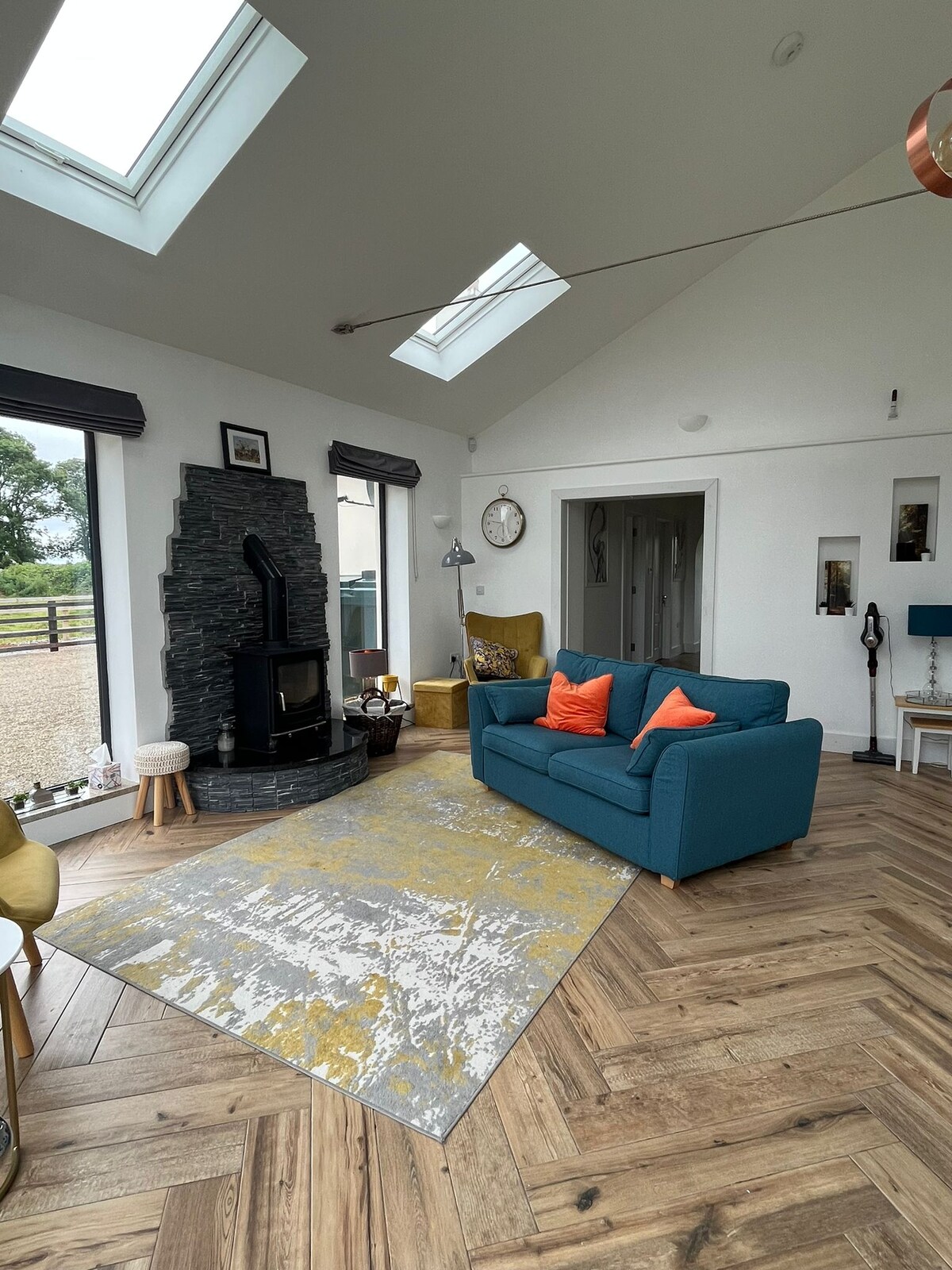 Recientemente renovado, este elegante granero de planta abierta se encuentra en el idílico paisaje rural del condado de Clare. Colinda con mi casa de campo de piedra de 150 años de antigüedad y ofrece un espacio vacacional independiente ideal para aquellos a los que les gusta la paz y la tranquilidad «fuera de lo común». El uso inteligente del espacio significa que tienes tu propia cocina, comedor y zona de dormitorio con una pequeña ducha/inodoro en suite y la sala de estar incluye un piano de cola Bluthner único para los amantes de la música.
