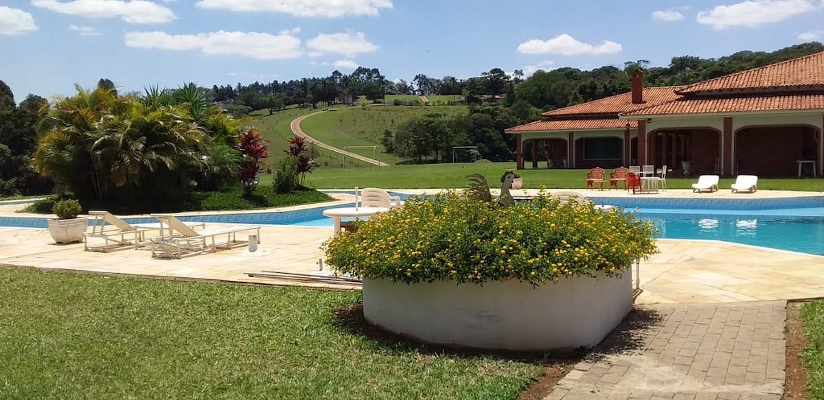Rancho con más de 6000 m², a 70 km de São Paulo. Alquilamos exclusivamente a familias. Tiene capacidad para 15 huéspedes y cuenta con 3 suites, piscina, sala de juegos, cancha de tenis, cancha de fútbol y zona de barbacoa. Tiene ventiladores de techo en todas las habitaciones (no hay aire acondicionado). No aceptamos mascotas. Durante la estancia, el propietario o los encargados de la limpieza siempre están presentes para brindar apoyo y seguimiento.