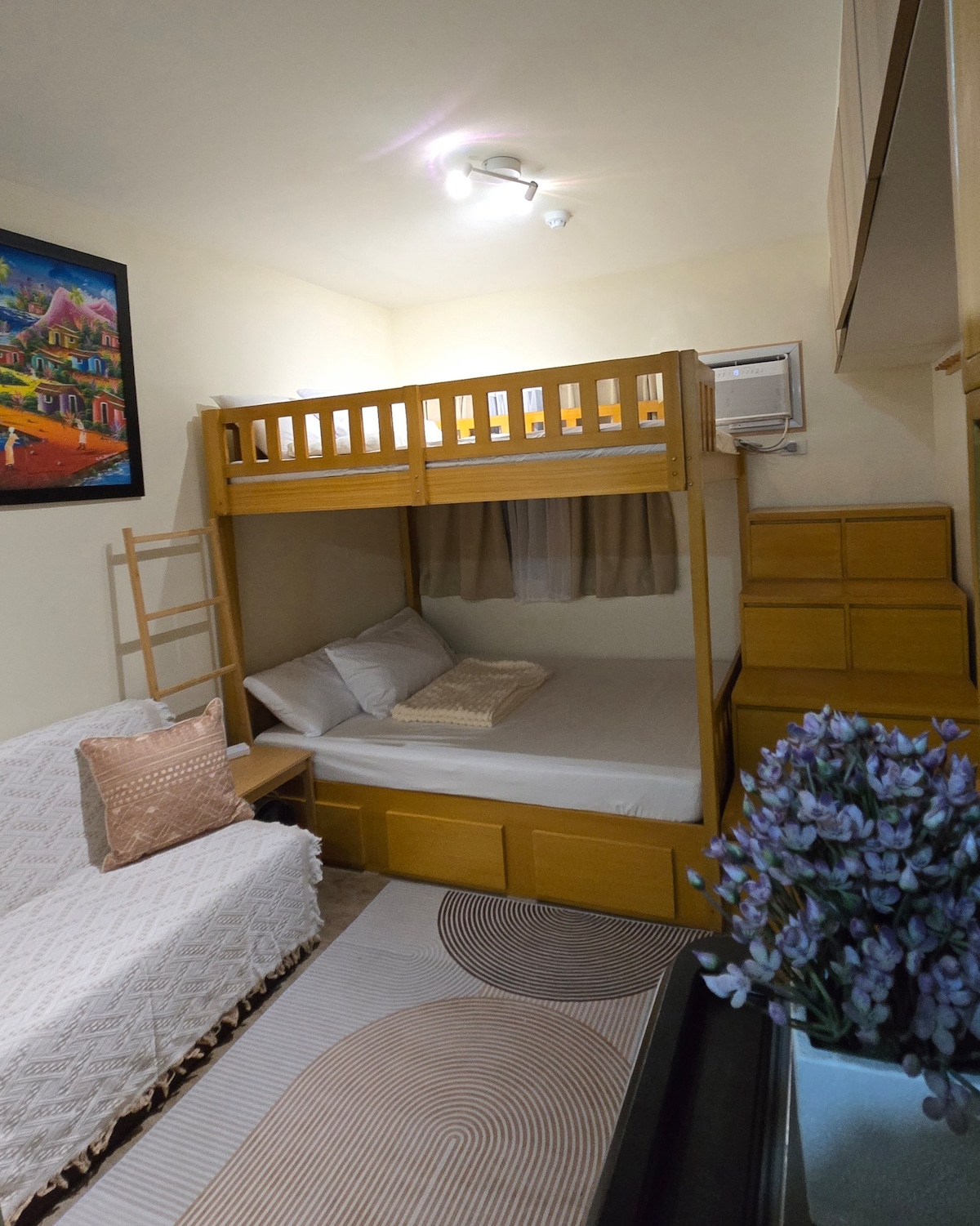 La unidad es nueva, tiene todas las comodidades como WiFi de 50 Mbps, barra de sonido y PlayStation con acceso a Netflix, HBO Max y Prime Video,la ubicación está cerca de las siguientes oficinas gubernamentales, DENR, DPWH y Camp Vicente Lim. La habitación está equipada con aire acondicionado y purificador de aire Sharp Plasmacluster con grupo de mosquitos incorporado.