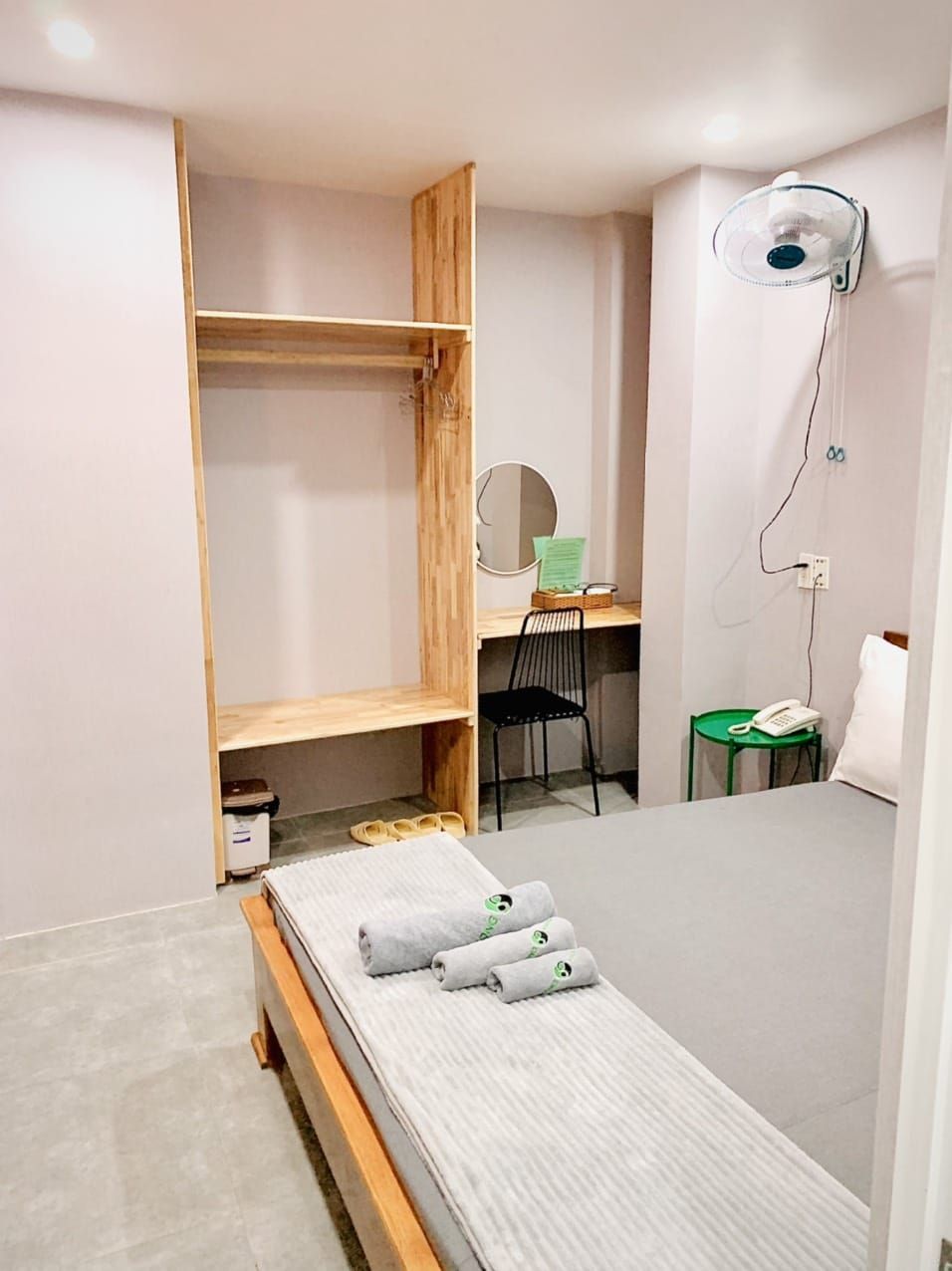 Room width: 16m² Bed: one bed, queensize (1m6) Furnitures inside room: Chair, desk, blanket, pillows towels, wardrobe, hangers, dustbins, mirror. Toiletries: Free and enough for 2 people, include: toothbrush, toothpaste, shampoo, comb, toiletpaper. Side window budget double room is the best choice for couple backpacking visitors with clean space, competitive price, staff's hospitality, it can satify your requirment and affordability.