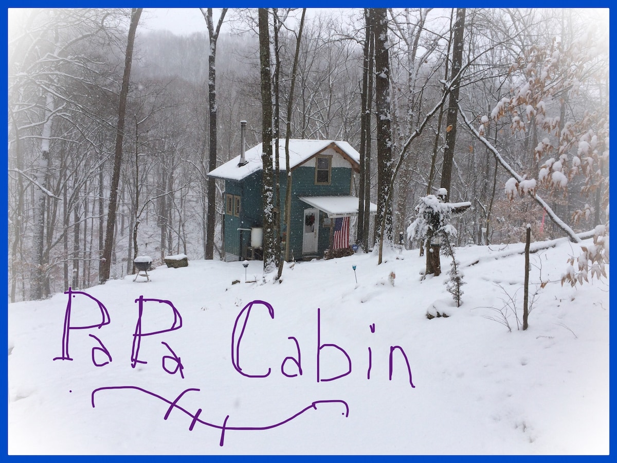 “Winter” at PaPa Cabin be prepared for a different experience. This little house, perched on a cliff, is off the grid, surrounded by forest. A quarter mile walk through the woods leads to the cabin. Bedroom sleeps two on the comfy bed. With only 12 volt (like your car) solar electricity, gas heat, some 12v fans (no AC) it will be an adventure! In the kitchenette, guests will find a propane range top, a fridge, and cooking utensils, bottled water, outside a charcoal grill.