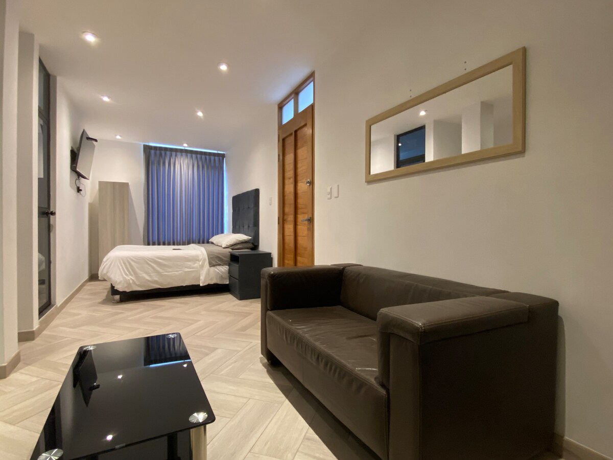 Minidepartamento de 35 M2, se encuentra ubicado en zona céntrica de la ciudad, cuenta con espacio de cocina, amplio balcón, baño privado y una confortable cama king size. Ideal para parejas o parejas con hijos pequeños. Ambiente muy acogedor de modernos acabados. Implementado con un pequeño comedor, vajilla para 4 personas, cocina electrica de 1 hornilla, hervidor eléctrico, plancha, tv con cable e internet de alta velocidad.