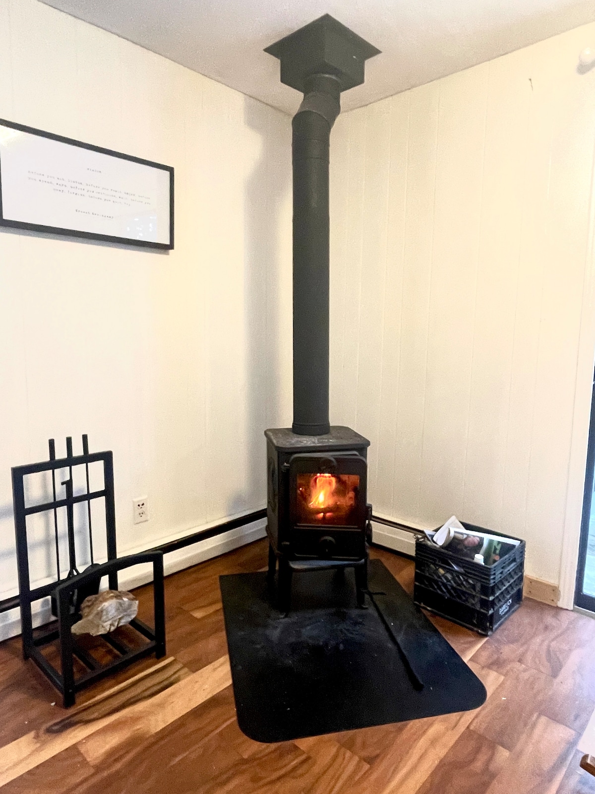 La habitación tiene una entrada independiente ubicada junto a un porche trasero cubierto con una mesa pequeña y sillas para uso en verano. Hay aire caliente y frío ajustable desde la bomba de calor de fuente de aire montada en la pared. La pequeña cocina es conveniente para café o té o una comida ligera (horno tostador, placa de inducción individual “caliente”, calentador de agua) Vivimos en un edificio histórico. Nuestro vecindario está muy cerca de la ruta 100. El pueblo de Waterbury y Stowe también están cerca con esquí, senderismo y ciclismo.