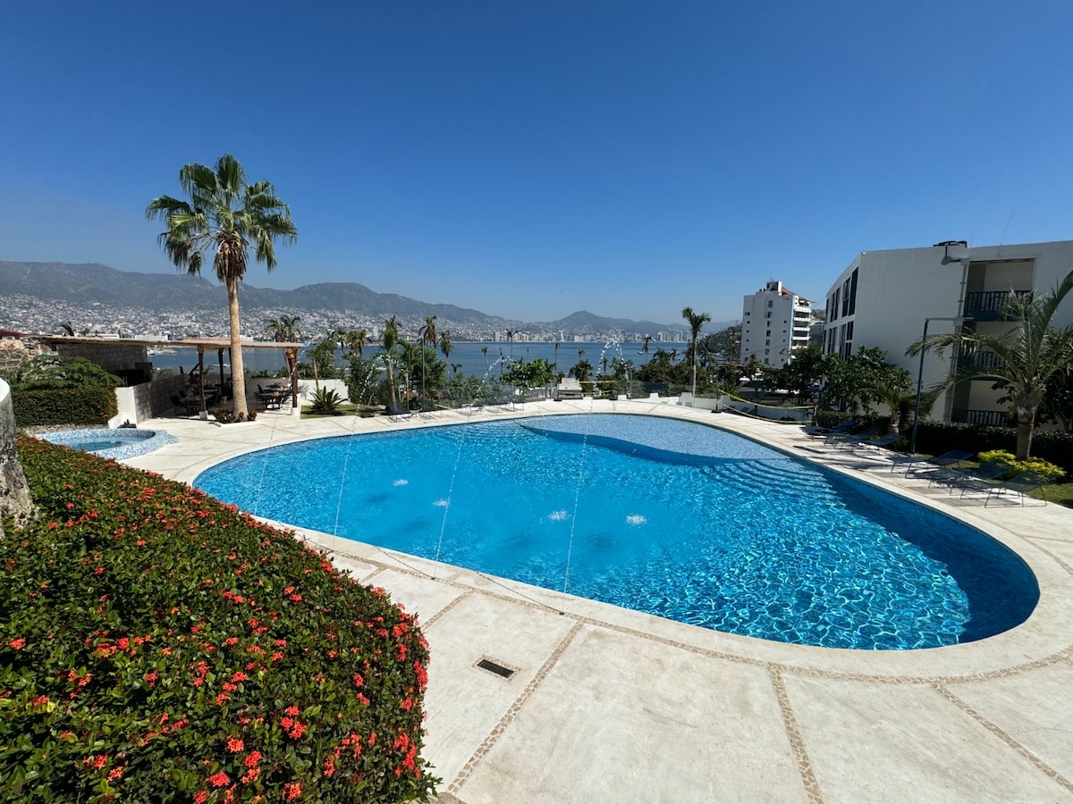 Acogedor departamento, con una vista excelente de la Bahía de Acapulco. Privacidad y sin el ruido para tener unas vacaciones agradables. Dos recamaras, dos baños completos, cocina equipada, aire acondicionado y ventiladores de techo para refrescar todo el departamento. La alberca a unos cuantos pasos de ti, disfruta de la vista. El depto. está recién remodelado por lo que en su mayoría todo es nuevo listo para que lo uses. Con excelente ubicación para ir a disfrutar de las playas.