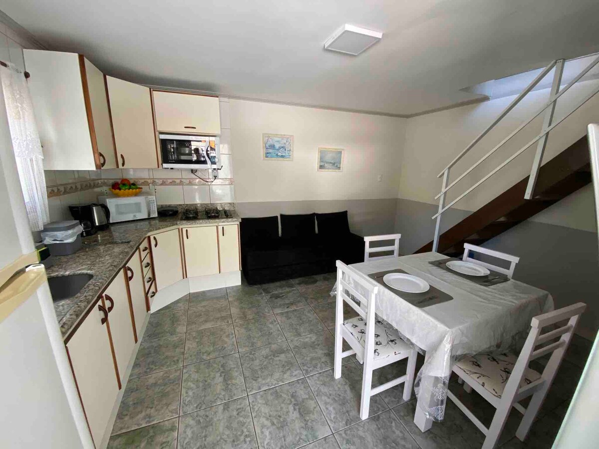 Estamos integrados con la naturaleza, con mucho verde, un limonero y un espacio para hamacas en la terraza exterior. La mini casa tiene acceso independiente y estacionamiento, tiene capacidad para 4 personas, ideal para una pareja con hasta 2 niños Tres playas son accesibles a pie desde la casa: Bombas (600 m), Ribeiro (700 m) y Bombinhas (1000 m). Se puede acceder fácilmente a las demás en coche. Con cocina, aire acondicionado y una ubicación conveniente, a una cuadra de la panadería, el mercado y la farmacia.
