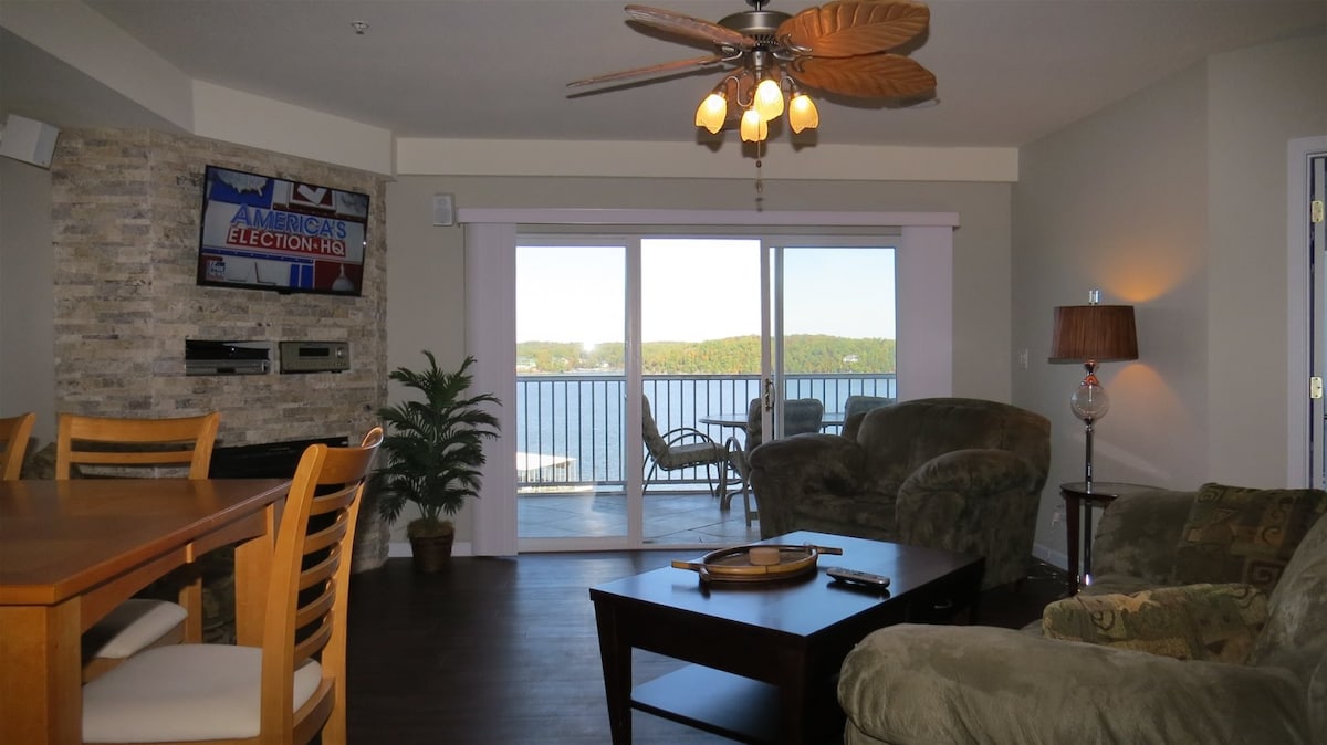 ¡Toma el ascensor hasta la puerta y disfruta de las vistas al lago desde el momento en que entras! Disfruta de una vista impresionante del canal principal en la milla 20 del hermoso lago de los Ozarks. La suite principal cuenta con una cama tamaño queen y una bañera con hidromasaje en el baño principal contiguo. El segundo dormitorio también tiene una cama tamaño queen y el tercer dormitorio tiene dos camas individuales. Este departamento está muy bien amueblado y tiene vistas al lago en todas partes. Hay un puerto deportivo justo al otro lado de la cala para tus necesidades náuticas.