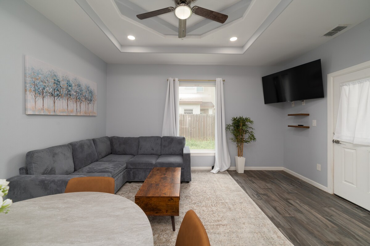 Esta encantadora casa de 2 dormitorios/2 baños de varios niveles es una de las dos que hay en el edificio. Cuenta con un gran televisor Roku en la sala de estar y una cocina totalmente equipada. Una cama tamaño king en el dormitorio principal, 2 camas de tamaño completo en el dormitorio 2 y un sofá cama en la sala de estar. Ventiladores de techo en todas las habitaciones y un cuarto de lavado con lavadora y secadora. El balcón trasero tiene vistas a la piscina. Wifi rápido, garaje y estacionamiento en la entrada para dos vehículos. Se admiten mascotas por una pequeña tarifa (2 máx.).