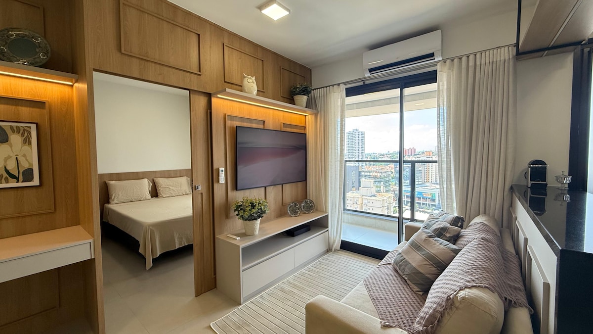 ¡Experimenta comodidad y practicidad! Hemos preparado un apartamento moderno, amueblado con gran cariño para tu estadía. ¡Te sentirás en casa! Ambiente acogedor con: Cocina completa, balcón soleado, cama doble con armario, Smart TV, Wi-Fi, aire acondicionado y ropa de cama/baño nueva y suave. Y más: además de un encantador estudio y ocio en el condominio, estarás en una ubicación privilegiada, cerca del Bosque de Jequitibás, Av. Norte-Sul y Cambuí, con excelentes restaurantes y cafés.