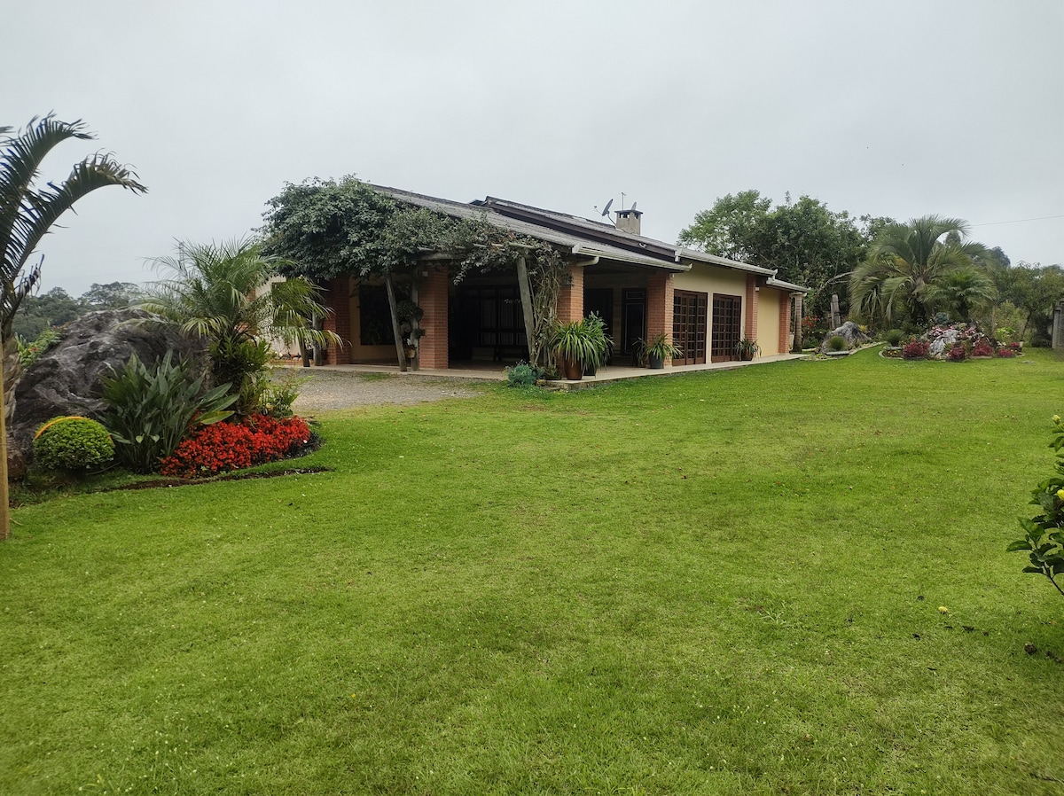El clima del interior muy cerca de Curitiba. Lugar simplemente tranquilo para descansar y relajarse, respirar el aire puro de las montañas verdes, maravillosa vista en un pedacito del paraíso. Amanecer la sinfonía de los pájaros, una paz en conexión con la naturaleza, impresionantes paisajes con muchas flores, un pequeño sendero en el bosque. Acogedora casa con chimenea, cómodas habitaciones completas con aire acondicionado, cocina y parrilla totalmente equipada.