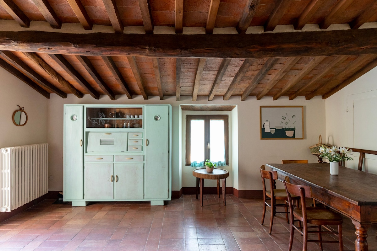Acogedor apartamento para 4 personas amueblado en estilo toscano y con vigas a la vista, inmerso en las suaves colinas de la campiña toscana. A disposición de los huéspedes jardín equipado, wifi gratuita, piscina compartida equipada, horno de leña y barbacoa, lavadora. El apartamento se ha obtenido de una bonita casa de campo de piedra de 1800 recientemente restaurada según la tradición toscana y dividida en tres cómodos apartamentos.