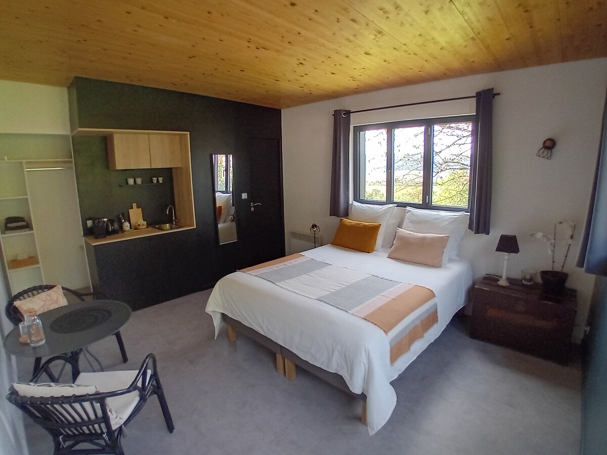 Estudio con entrada independiente situado en nuestra residencia principal con zona de estar cocina equipada, zona de escritorio, baño con ducha con inodoro, cama king size situado en altillo. El jardín de la casa contiguo al estudio y puesto a su disposición, terreno de petanca. Se admiten animales con mucho gusto siempre que se incluyan en la reserva. Este alojamiento no es adecuado para personas con dificultades de movilidad: acceso por escalera y altillo escalera (foto)