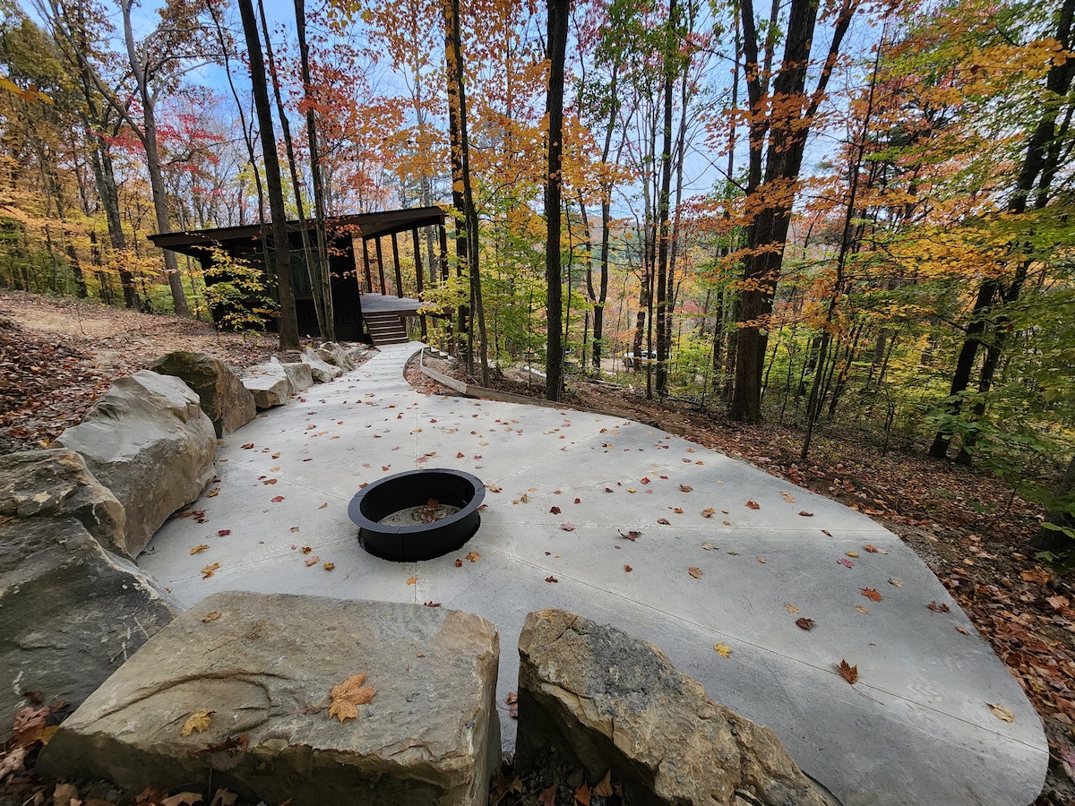 Cabaña de cristal para bañarse en el bosque. 24 acres. Vistas al bosque de 360°. Sauna de infrarrojos, sillón de masaje y ducha de efecto lluvia para un reinicio de cuerpo completo. Jacuzzi, chimenea Malm en el patio, además de parrilla y espacios de descanso para comidas lentas. En el interior, una pantalla de 85 pulgadas y suaves detalles de piel de oveja invitan a un profundo desenrollamiento. Gira vinilos, respira en los árboles y explora Hocking Hills a solo 5 millas de distancia.