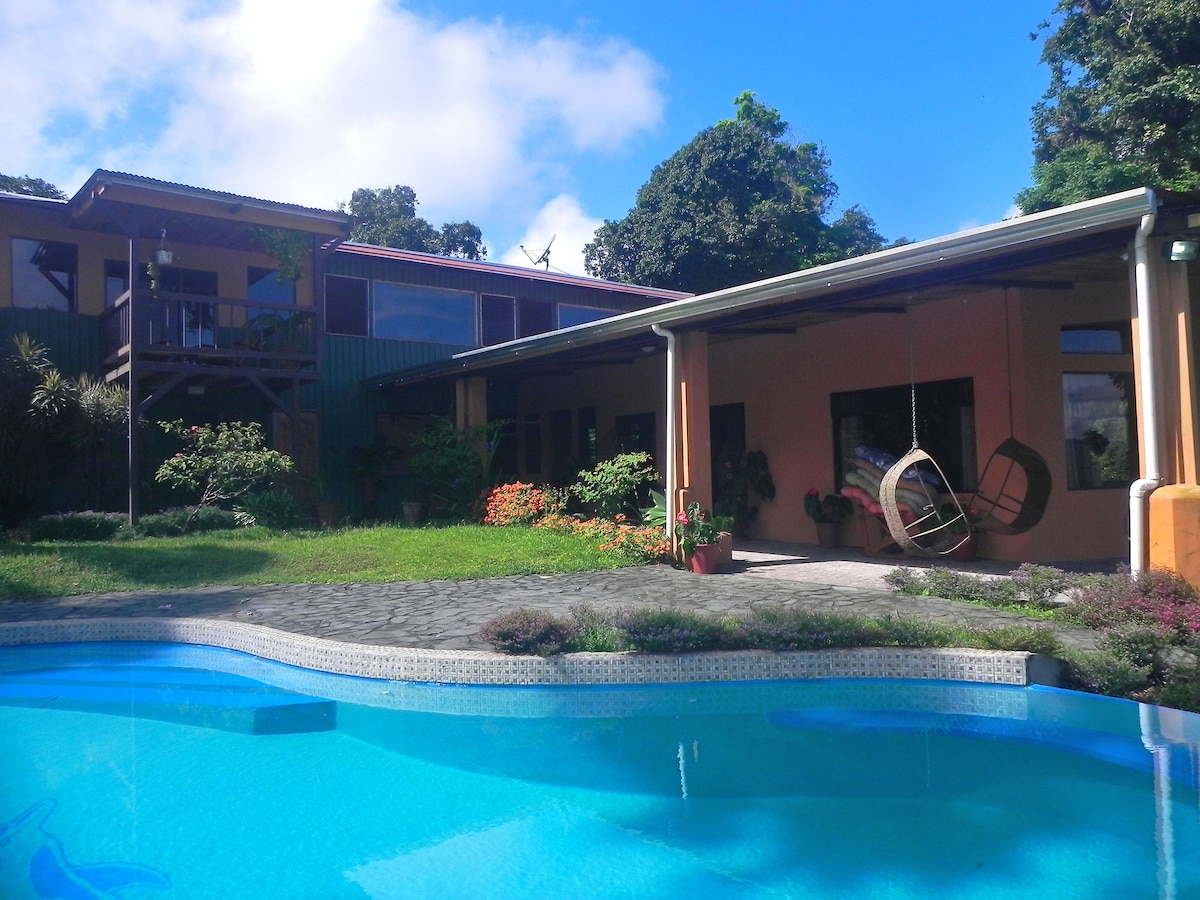 En los terrenos de Nepenthe B&B, la casa en la cima de la colina del propietario está rodeada de jardines tropicales y selva en la selva tropical del noroeste de Costa Rica, tiene una vista impresionante del lago Arenal y el volcán Arenal y tiene vistas a la ciudad de El Castillo.