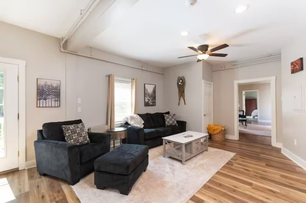 Entrada y espacio privados. Puertas francesas, grandes ventanales, luminoso y espacioso. Sala de estar grande. Dormitorio con cama queen. Dormitorio con cama king (dos camas individuales unidas como king) todo el tiempo. Pequeña cocina con microcafetera y nevera. NO HAY COCINA, solo un quemador NuWave. Entra y sal a tu antojo. Este apartamento es el nivel inferior de toda nuestra casa. Espacio muy privado y separado. Disfruta de 25 acres de tierra boscosa. A solo 2 millas de la ciudad. Debes tener 21 años o más para hacer la reserva. No admitimos niños menores de 12 años. No se permiten fiestas. No se admiten mascotas. No se permite fumar.