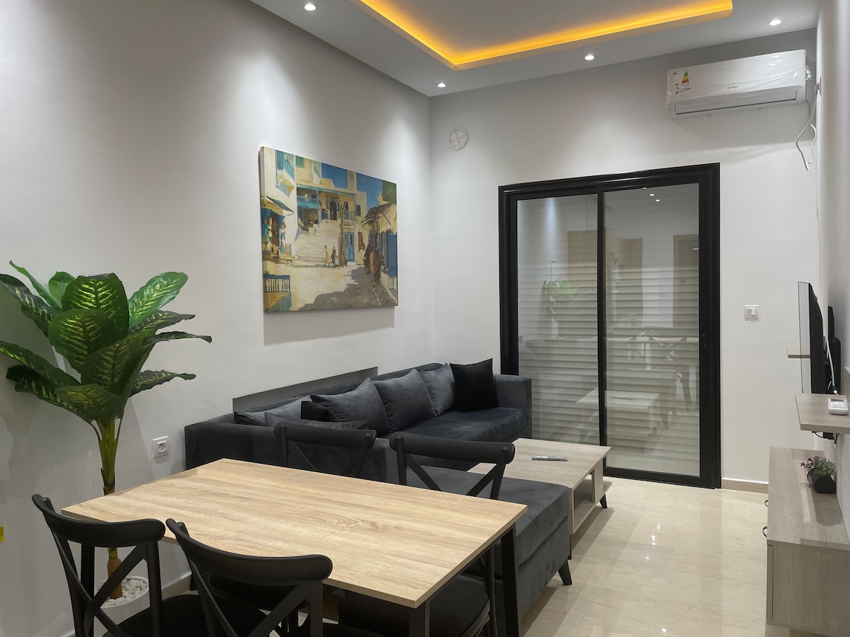 Estudio refinado a dos pasos de Cartago, a 8 minutos de Sidi Bou Saïd y La Marsa, y a 18 minutos del aeropuerto. En el primer piso de una residencia tranquila, este alojamiento de estilo limpio ofrece un espacio optimizado, una cocina equipada, Wi-Fi rápido y un ambiente armonioso. Ideal para teletrabajo o escapadas. Posibilidad de estacionar un automóvil de forma gratuita frente a la entrada (no cubierta).