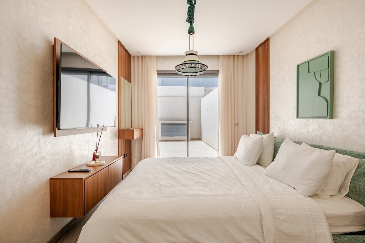 Departamento de lujo de 1 dormitorio con terraza privada en Oasis, Casablanca. Ubicación privilegiada para negocios: a 7 minutos de Casa Nearshore y Sidi Maarouf, a 4 minutos de Casa Finance City, a 20 minutos del aeropuerto Mohammed V a través de Taddart. Sala de estar luminosa, dormitorio con aire acondicionado, cocina totalmente equipada, wifi de alta velocidad, TV inteligente, estacionamiento y llegada autónoma. Cerca de OCP, Coca-Cola, Samsung y las principales sedes. Ideal para viajeros de negocios y estancias de media duración. Los anfitriones hablan inglés, francés, árabe y holandés.