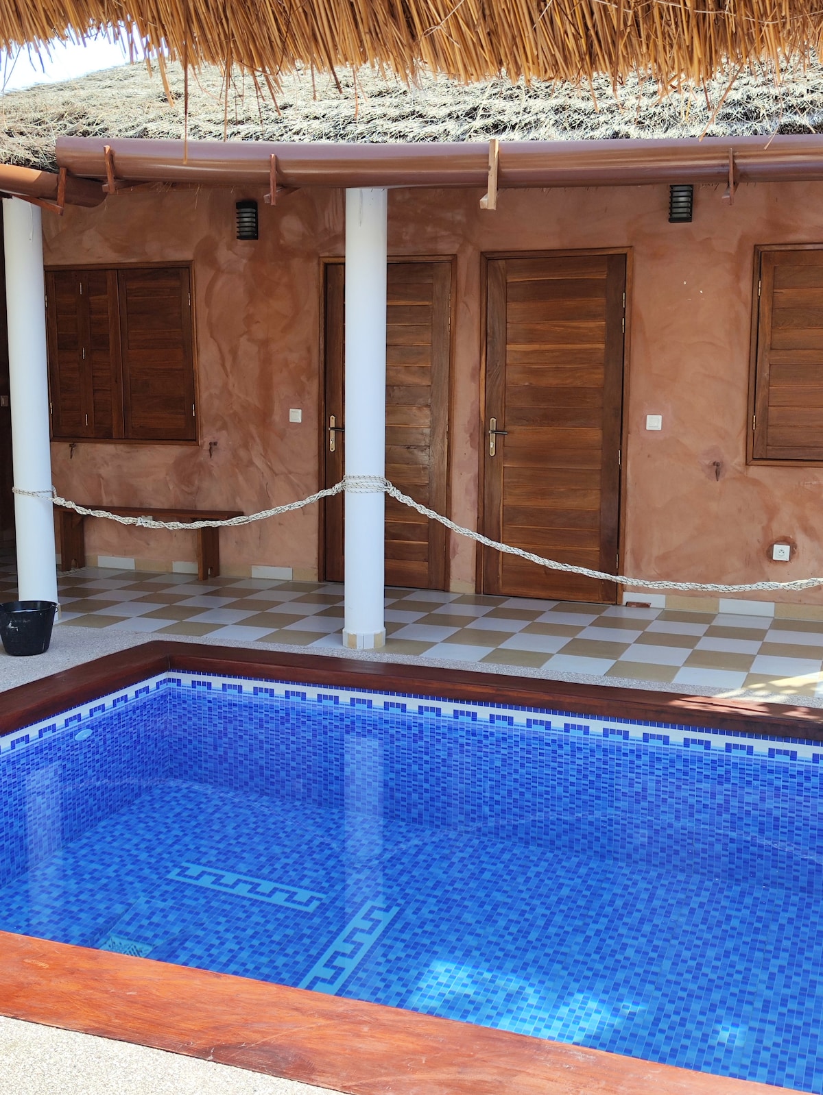 Una casa moderna pequeña y única de dos pisos. Tiene capacidad para cuatro personas, una cama doble y un sofá cama. El edificio tiene una zona de cocina con dos quemadores de gas, nevera, congelador y lavadora. El inodoro está abajo y arriba con ducha en el baño. Cada habitación tiene ventilador de techo y un ventilador en la planta baja. Acceso a la piscina y a la cocina exterior. Dos balcones del primer piso permiten una visión completa de las aves Tanji. Cómodo, limpio y moderno con acceso completo a Internet. Seguridad las 24 horas en el lugar.