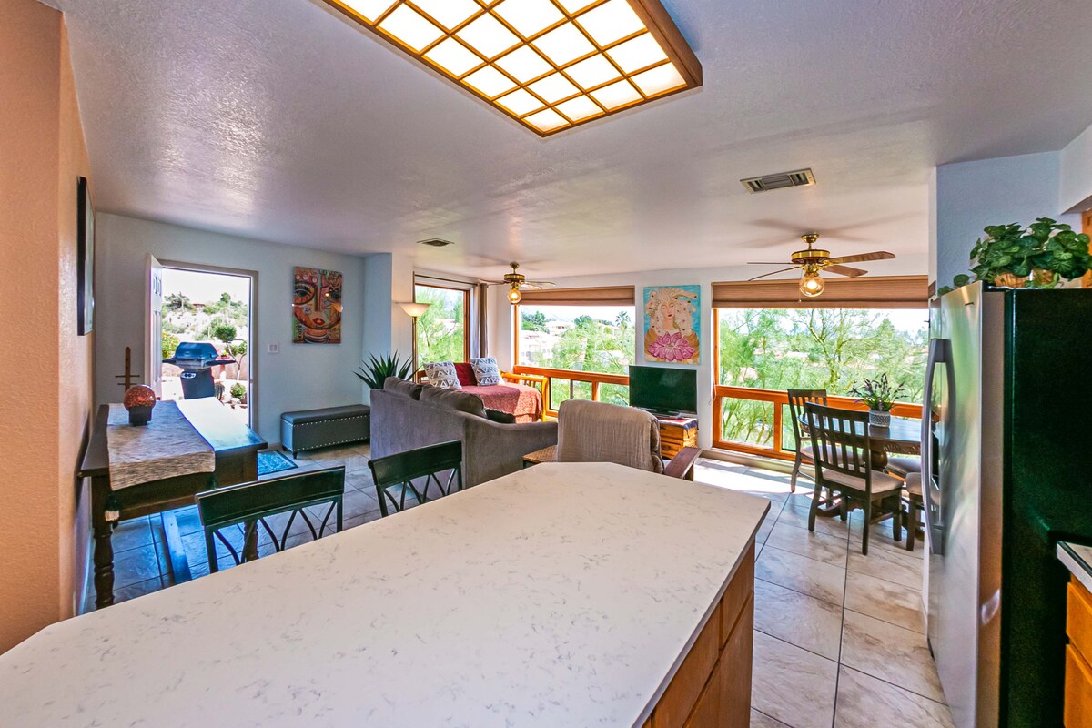 Ocotillo Unit es un B&B más grande con un dormitorio completo con una cama tamaño king y un baño completo. La sala de estar tiene un sofá cama para acomodar huéspedes adicionales. La cocina está totalmente equipada con una isla central para preparar alimentos o con una disposición para sentarse a desayunar, almorzar o cenar. Tiene 2 entradas con aparcamiento cubierto a un lado y la segunda entrada es para acceder al patio exterior y a la piscina.