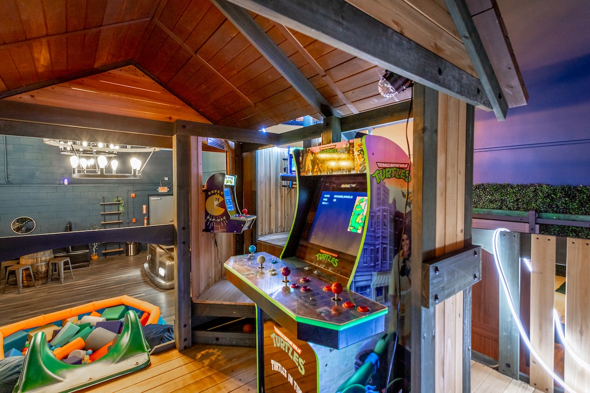 ¡Planifica una estadía inolvidable para tus personas favoritas en este espacio único y familiar! En el interior, encontrarás una enorme cocina completa, 2 baños completos y un teatro y una casa del árbol Arcade. La configuración de estilo pijama incluye 12 catres, sofás modulares, ENORMES bolsas de frijoles de gel y espacio en el piso. También hay una cama completa en la sala de juegos. Además: un escenario, proyector, Roku TV, Xbox y un TOBOGÁN en la piscina de pelotas. Ideal para unas vacaciones familiares que todos puedan disfrutar. ¡Este te dará puntos extra con los niños!