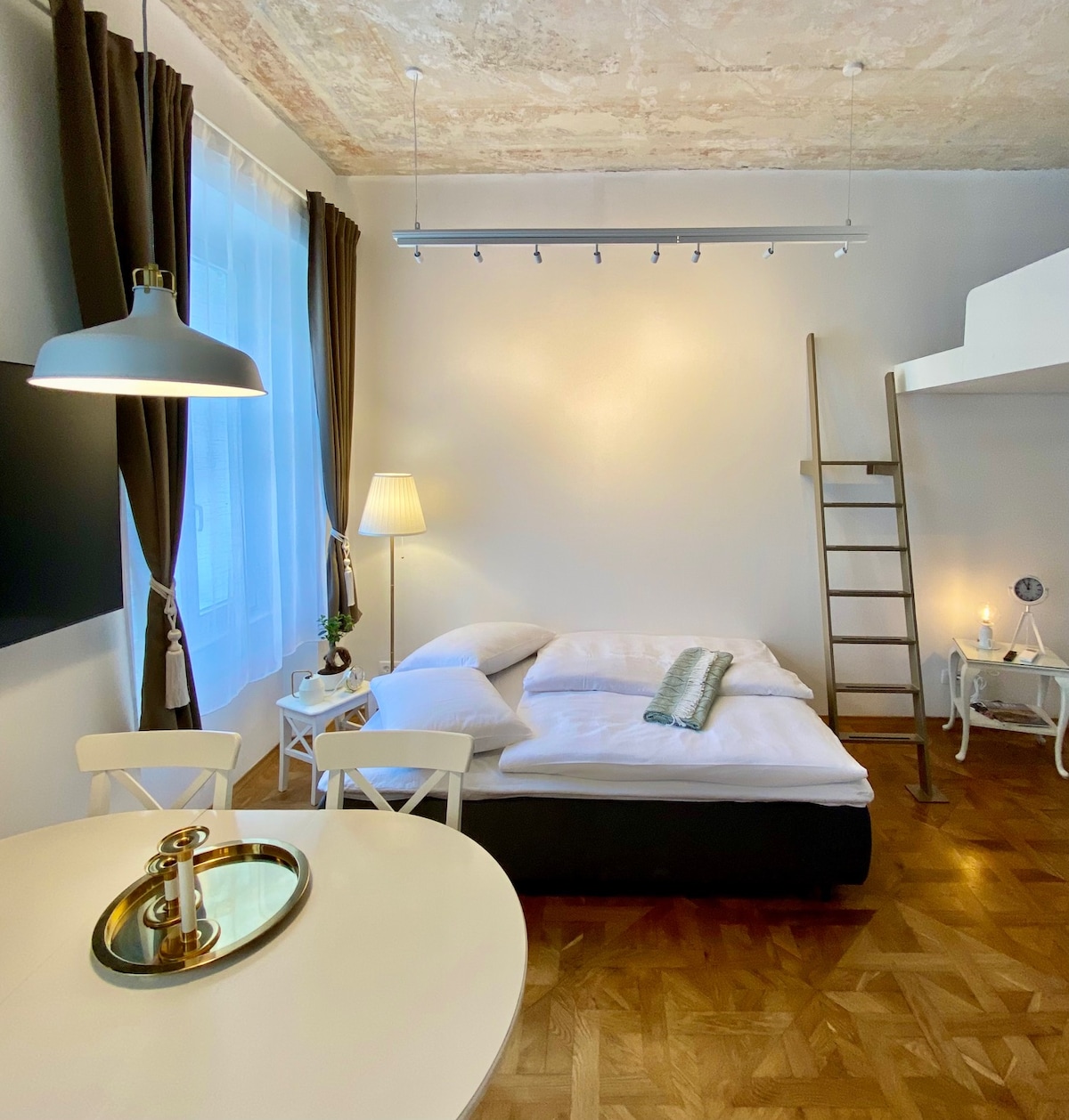 Ubicado al comienzo de la ciudad histórica, nuestro apartamento del casco antiguo recién renovado cuenta con techos altos y un diseño abierto y luminoso. La estantería da a la acogedora sala de estar y su gran pantalla de televisión que guarda las escaleras a la maravillosa cama elevada. La cocina tiene mucho espacio y todas las necesidades. La plaza de la Revolución Francesa está justo al lado, al igual que el río Ljubljanica. El apartamento es perfecto para parejas que exploran el casco antiguo.