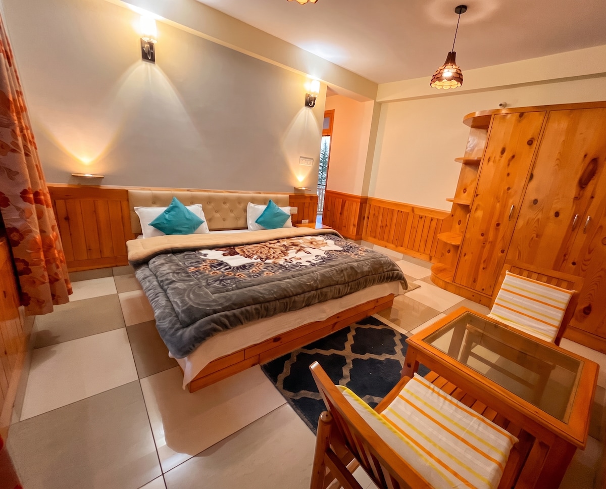 Se encuentra en el pueblo más prístino de Kullu-Manali en Naggar. La espaciosa habitación bien decorada ofrece una cama doble con baño adjunto, TV LED, armarios, una pequeña zona de estar y una terraza en la puerta de entrada con espléndidas vistas de los huertos y las montañas. Hay una zona de jardín con huertos de manzanos y bonitas flores por todas partes. El espacio es el más adecuado para 2 adultos y un niño. La comida fresca y deliciosa casera está disponible en la tarjeta del menú de nuestra cocina.