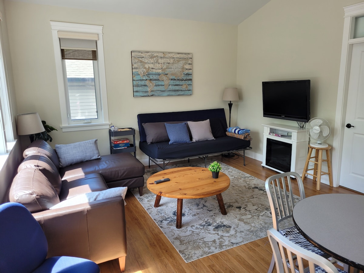 La suite Sunlight de K y M se encuentra entre Pandosy Village y el centro de Kelowna. Estamos a pocos pasos del hospital, las playas y cerca de tiendas, restaurantes y transporte público. Nuestra avenida conecta con el corredor de Abbott Street, lleno de casas patrimoniales de Kelowna y construido con senderos para caminar y montar en bicicleta. La suite de invitados de 885 pies cuadrados en el segundo piso (último piso) tiene una entrada privada, techos altos y una terraza soleada. Se proporciona un pequeño desayuno continental inicial en la suite.