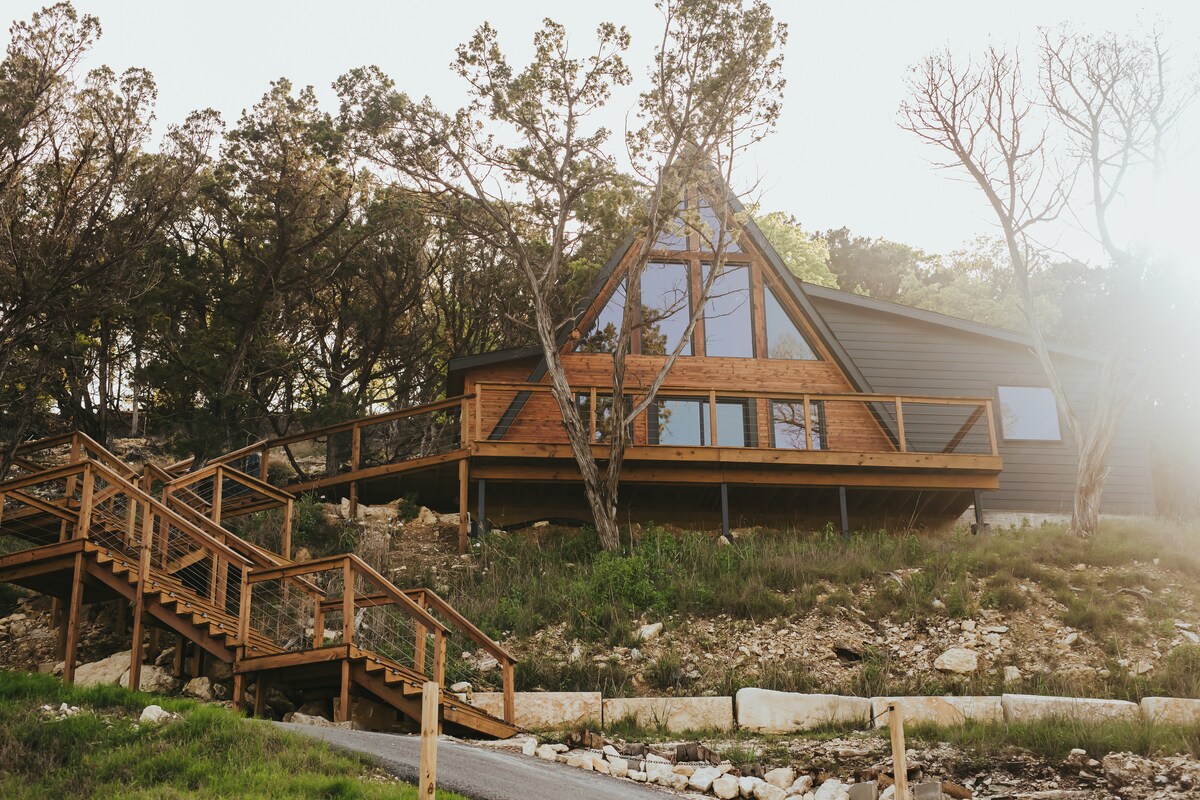 En lo alto de una colina con vistas al magnífico TX Hill Country se encuentra la cabaña con el marco en A más impresionante que jamás hayas visto. Con una mezcla de estilo de mediados de siglo y toques artísticos, este espacio es precioso. La cabaña está escondida en un bolsillo de naturaleza rodeado de 3 acres de robles, olmos y enebros. Las amplias ventanas delanteras y la terraza elevada ofrecen una increíble vista del atardecer a través de las colinas y la iluminación del cielo oscuro prepara el escenario para unos impresionantes cielos estrellados. ¡El jacuzzi y la ducha exterior son la guinda del pastel!