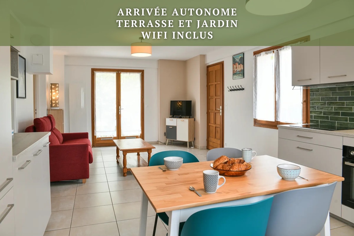 Impresionante apartamento tranquilo, totalmente nuevo, acogedor, con plaza de aparcamiento frente al alojamiento. Orientado al sur, tendrá una bonita terraza y un jardín privado (vistas a las montañas), disfrutará de un acogedor dormitorio con una gran cama doble, una sala de estar con cocina americana totalmente equipada y un baño con inodoro separado. Estará a 45 minutos de las primeras estaciones de esquí o Grenoble, y a solo 25 minutos de Chambéry y Albertville. Autopista a 5 minutos.