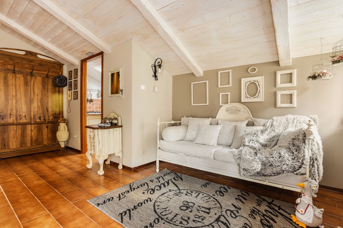 Nuestra casa, entre los árboles, vive en un apacible aislamiento a un par de kilómetros de la localidad más cercana. Somos Riccardo, Cristina, Lorenzo, Bianca y Alice. Elegimos venir aquí, al bosque, para empezar a vivir una vida sencilla pero plena, aprendiendo de la naturaleza. Les ofrecemos un ático abuhardillado renovado con esmero por Riccardo, con cama doble, sofá cama (ambos bajo lucernarios), cocina americana, baño y una amplia vista al valle.